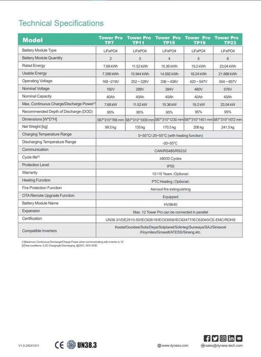 Dyness to renomowany producent systemów magazynowania energii, specjalizujący się w technologii LiFePO4 oraz skalowalnych rozwiązaniach wysokonapięciowych. Seria Tower Pro została zaprojektowana z myślą o maksymalnej elastyczności, bezpieczeństwie i długiej żywotności. Dyness Tower Pro TP19 to solidny wybór dla użytkowników oczekujących wysokiej mocy, dużej pojemności oraz stabilnej pracy systemu magazynowania energii przez wiele lat.