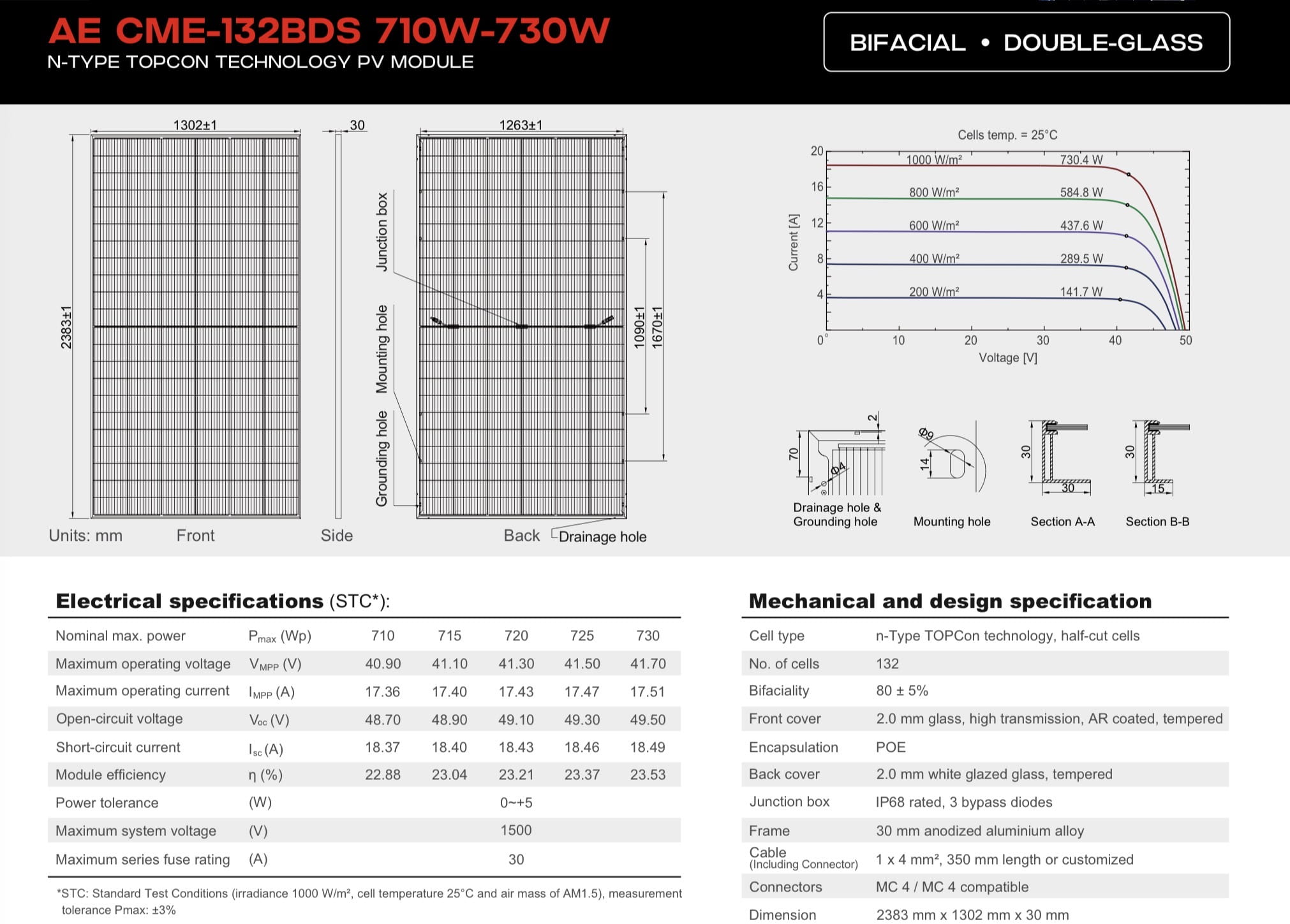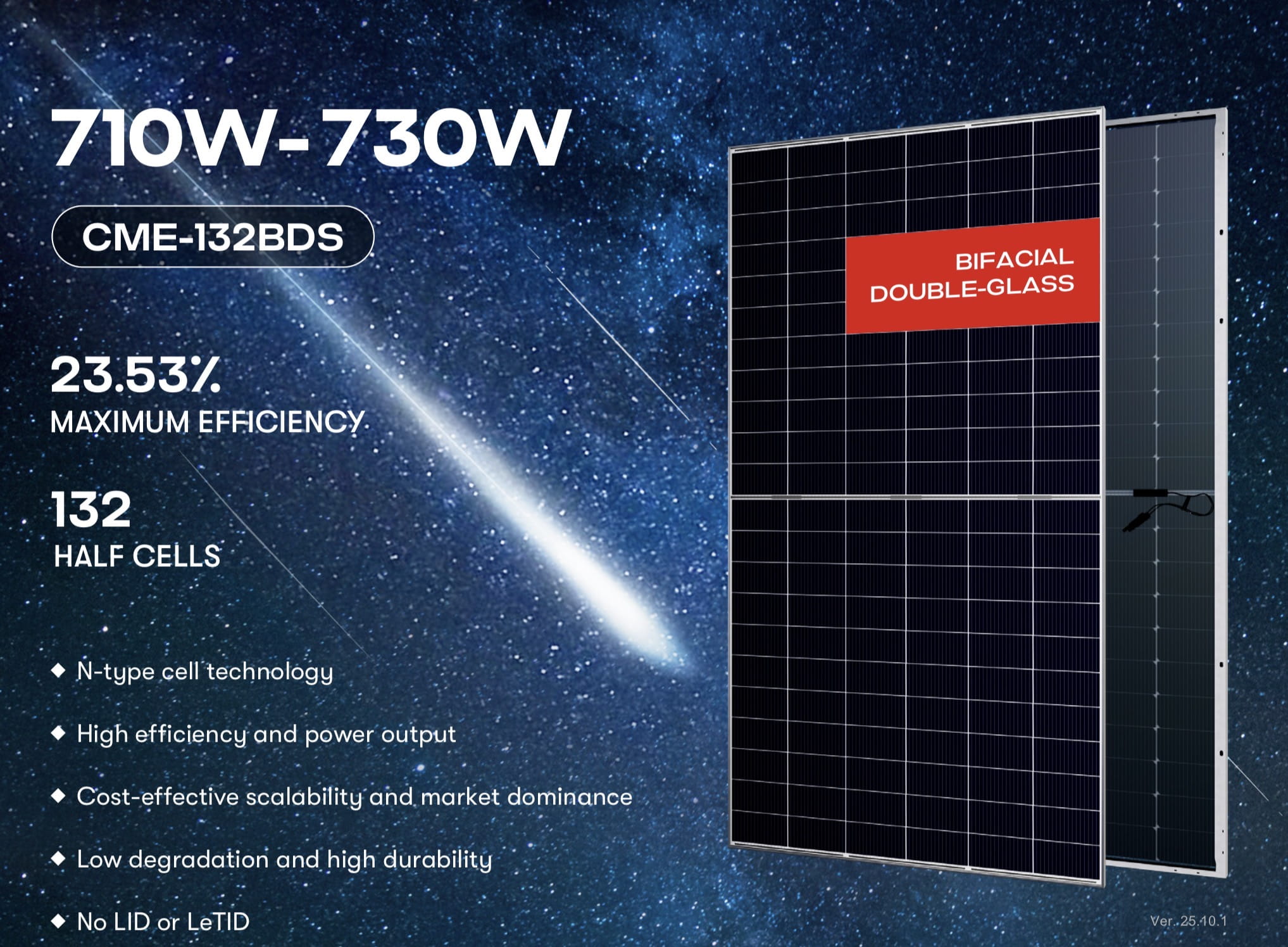 Panel fotowoltaiczny AESOLAR CME-132BDS o mocy 730W wykonany w technologii bifacial double glass oraz ogniwach N-Type TOPCon. Moduł dwustronny pozwala na dodatkową produkcję energii od strony tylnej, co zwiększa uzysk nawet o kilkanaście procent w zależności od warunków montażu.