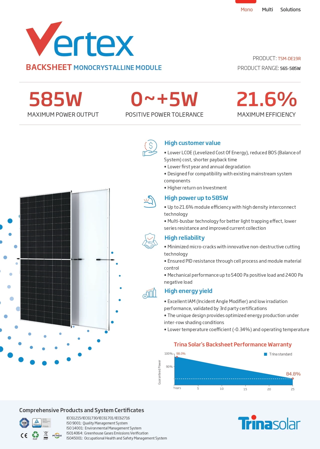Przedmiotem sprzedaży jest panel fotowoltaiczny Trina Solar o mocy 575W w technologii monokrystalicznej z konstrukcją backsheet.