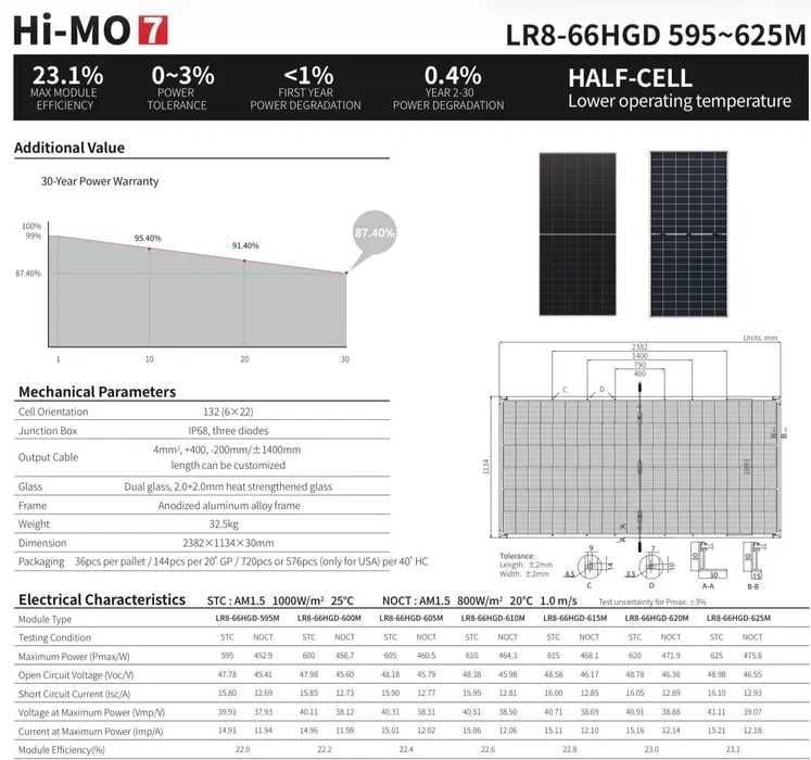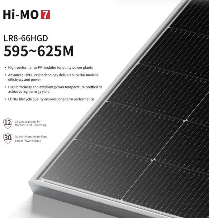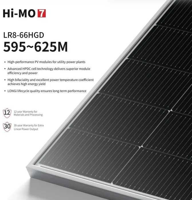 Nowoczesny moduł fotowoltaiczny klasy premium z serii Hi-MO 7, oparty na technologii HPDC, zapewniający bardzo wysoką sprawność, niską degradację oraz stabilną produkcję energii przez 30 lat. Konstrukcja bifacial glass-glass umożliwia dodatkowy uzysk energii z tylnej strony, co zwiększa całkowitą wydajność instalacji.