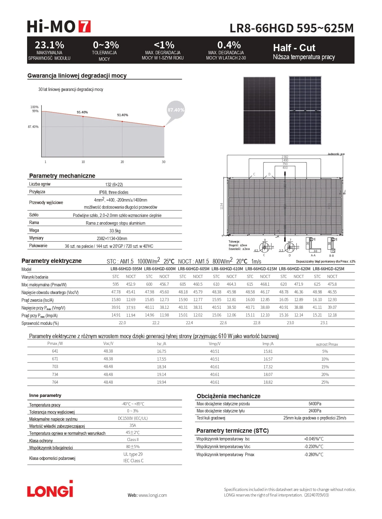 Nowoczesny moduł fotowoltaiczny klasy premium z serii Hi-MO 7, oparty na technologii HPDC, zapewniający bardzo wysoką sprawność, niską degradację oraz stabilną produkcję energii przez 30 lat. Konstrukcja bifacial glass-glass umożliwia dodatkowy uzysk energii z tylnej strony, co zwiększa całkowitą wydajność instalacji.